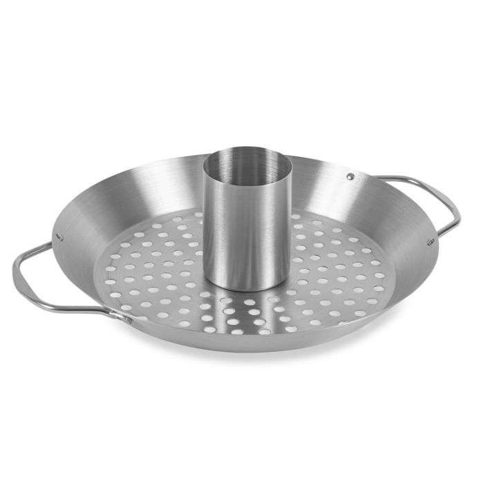 The durable plated steel holder features handles for convenience also known as beer butt chicken.